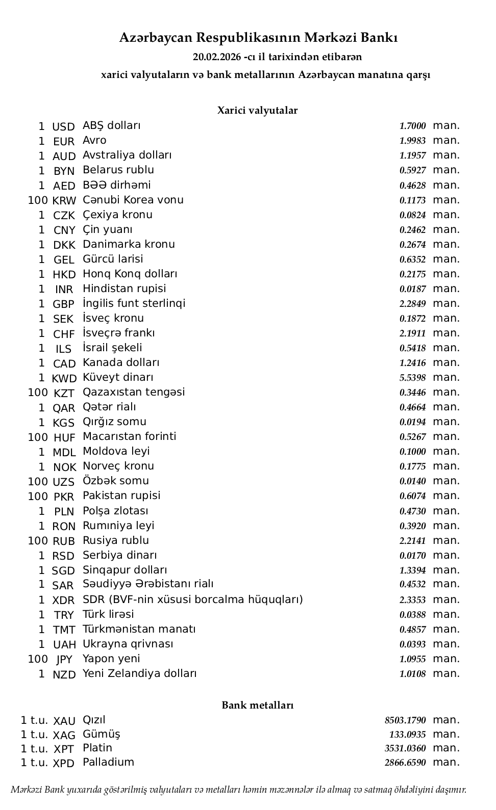 Rəsmi məzənnələr açıqlandı