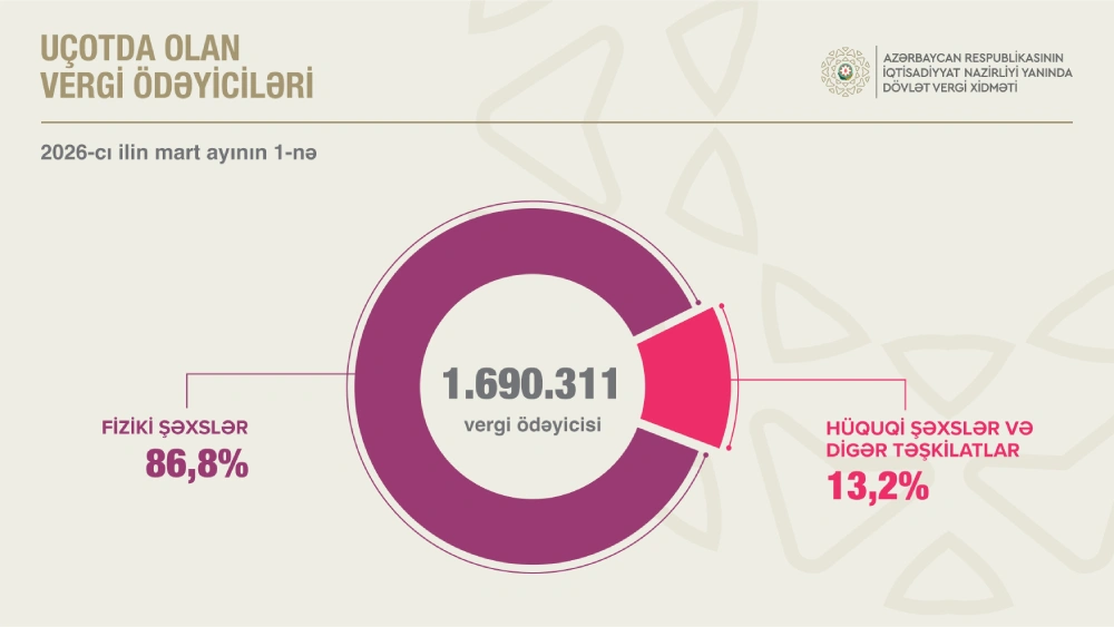 2026-cı ilin mart ayının 1-nə respublika üzrə uçotda olan 1 milyon 690 min 311 vergi ödəyicisinin 86,8 faizi fiziki şəxslər, 13,2 faizi hüquqi şəxs və digər təşkilatlar olub.