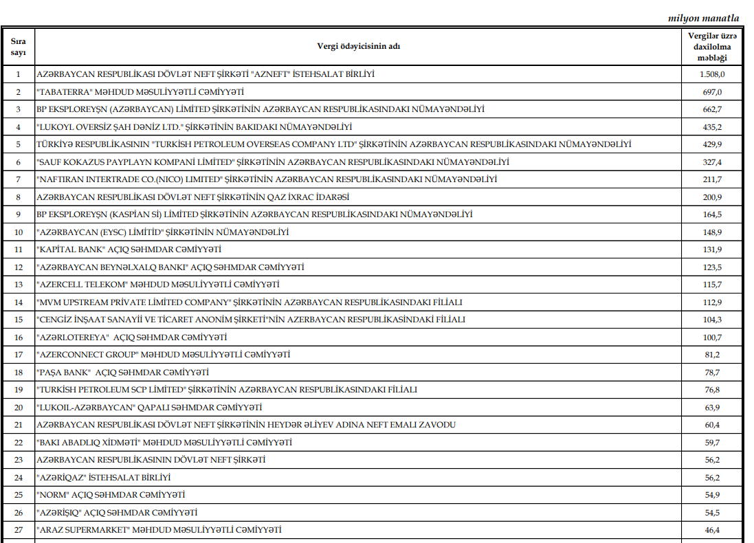 Ötən il "AZERCONNECT GROUP" MMC şirkəti ödədiyi 81,2 milyon manat vergi məbləğilə 17-ci, "Bakcell" MMC şirkəti ödədiyi 26,5 milyon manat vergi məbləğilə siyahıda 54-cü yeri tutub.