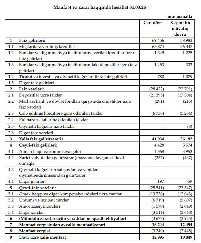 2026-cı ilin ilk rübündə bankın faiz gəlirləri 69 milyon 456 min manat təşkil edib. Bu, ötən ilin eyni dövrü ilə müqayisədə 10 milyon 473 min manat və ya 17,8 % artım deməkdir.