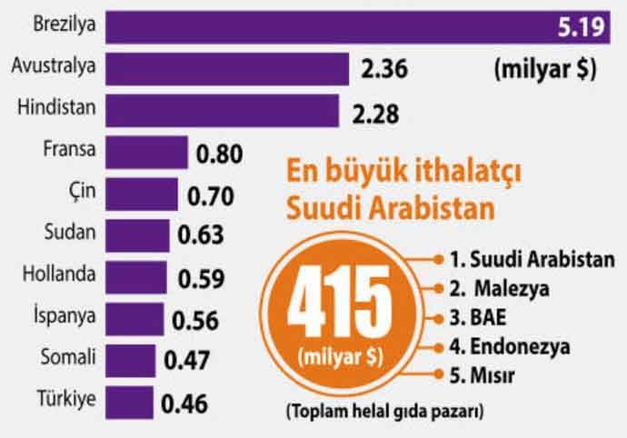 Halal bazarında birinci yeri 5 milyard dolları aşan ixracı ilə Braziliya tutur.