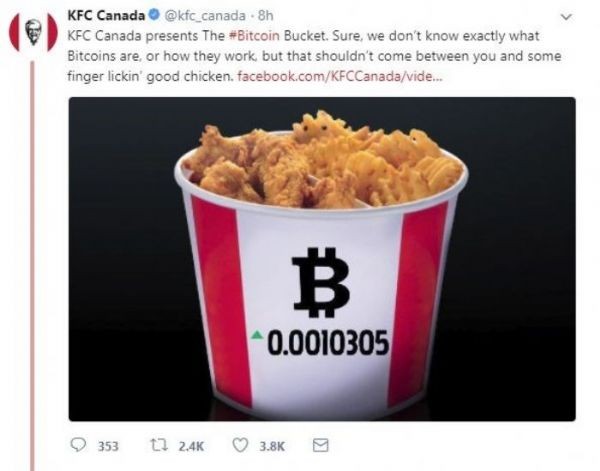 "Marja" xəbər verir ki, bu mübahisələr davam edərkən "fast food" nəhəngi KFC-nin Kanada rəsmi Twitter hesabından verdiyi açıqlama, Bitcoin-ə sərmayə qoymaq istəyənləri həyəcanlandırıb.