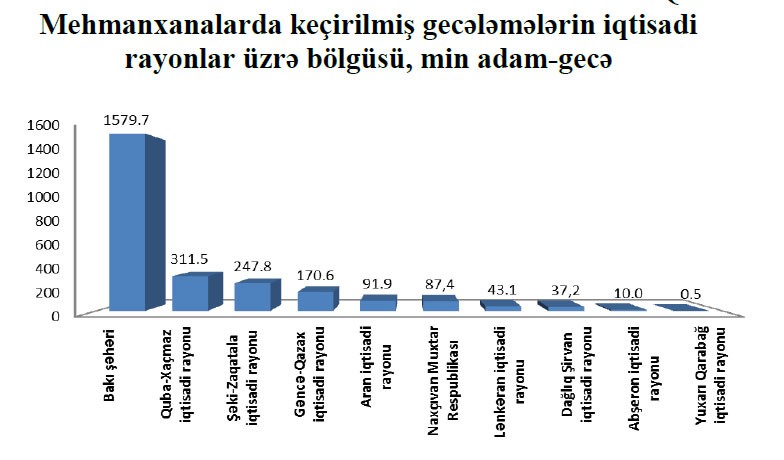 Mehmanxanaların ümumi tutumundan il ərzində orta istifadə səviyyəsi ölkə üzrə 17,2 faiz təşkil etmişdir. Bu göstərici Naftalanda 55,1 faiz, Bakıda 30,3 faiz, Qəbələdə 16,0 faiz, Qusarda 11,9 faiz, Gəncədə 7,5 faiz, Qaxda 7,2 faiz, Şamaxıda 6,6 faiz, Şəkidə 6,4 faiz, Lənkəranda 6,1 faiz, Xaçmazda 5,8 faiz, İsmayıllıda 5,7 faiz, Qubada 3,4 faiz, Masallıda 3,3 faiz olmuşdur.
