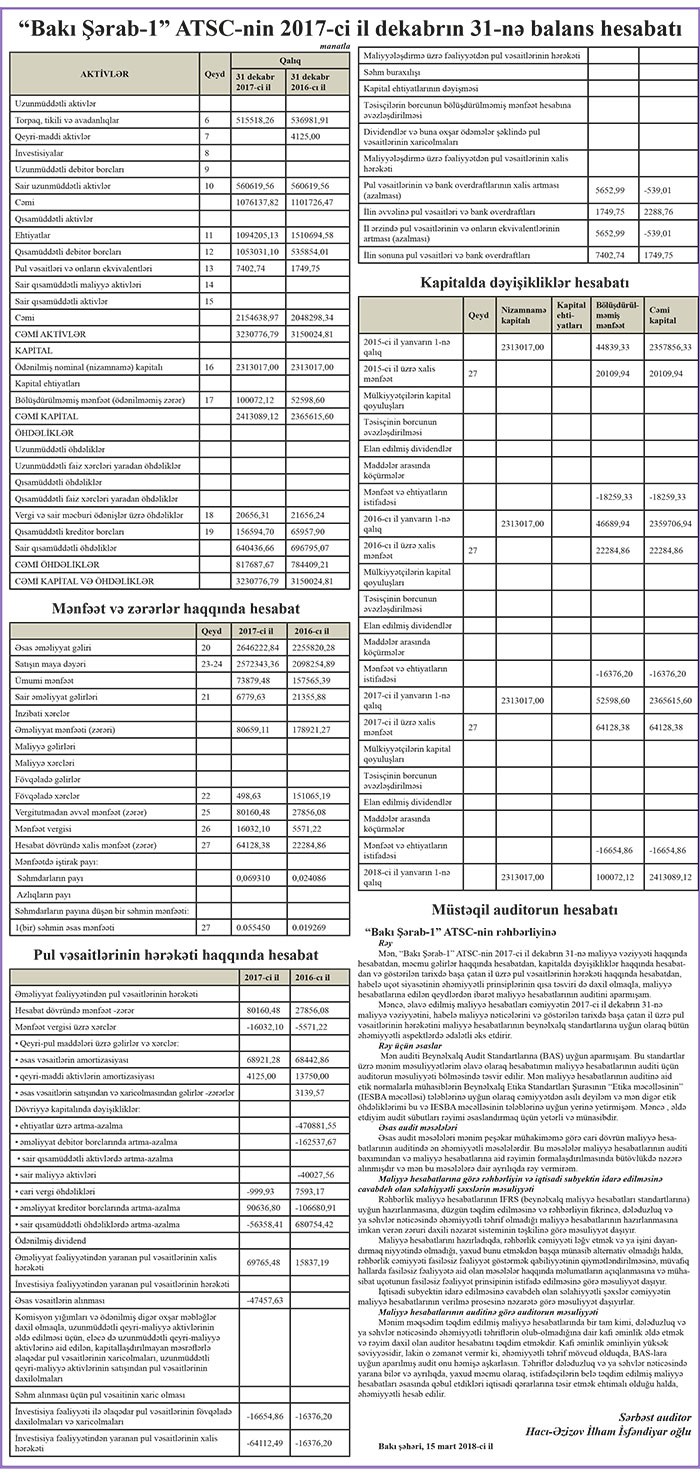 Ötən ilin sonunda “Bakı Şərab-1” 2 milyon 413 min manat cəmi aktivlərə malik olub.