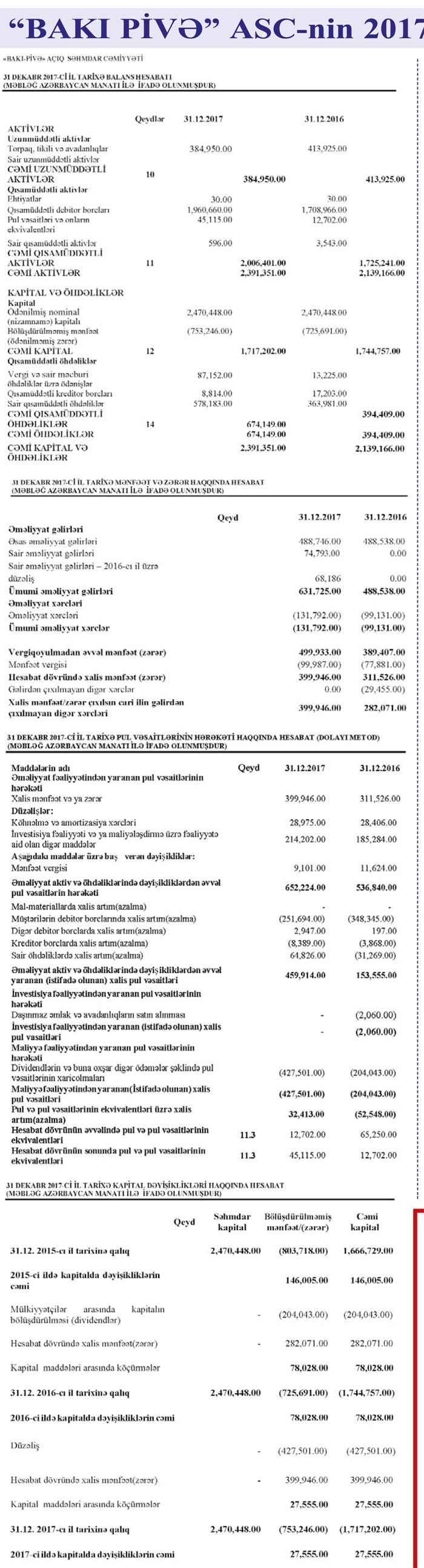 "Bakı-Pivə" ASC 2017-ci ili 399 min 946 manat xalis mənfəətlə başa vurub. Müqayisə üçün qeyd edək ki, ASC 2016-cı ili 311 min 526 manat xalis mənfəət ilə bağlamışdı.