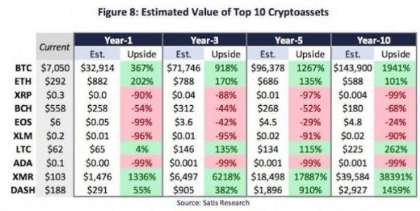 Hazırda kriptovalyuta dünyasının ən populyar üzvü olan Bitcoin-in qiyməti hazırda 7 min dollar səviyyəsindədir. Ötən il 20 min dolları test edən Bitcoin-in qiymətinin 10 il sonra 143 min dollara çatacağı gözlənilir. Başqa sözlə, Bitcoin-in dəyərinin 10 ildə 20 dəfə artacağı ehtimal edilir.