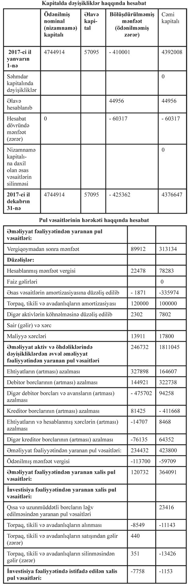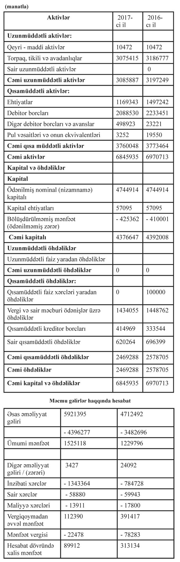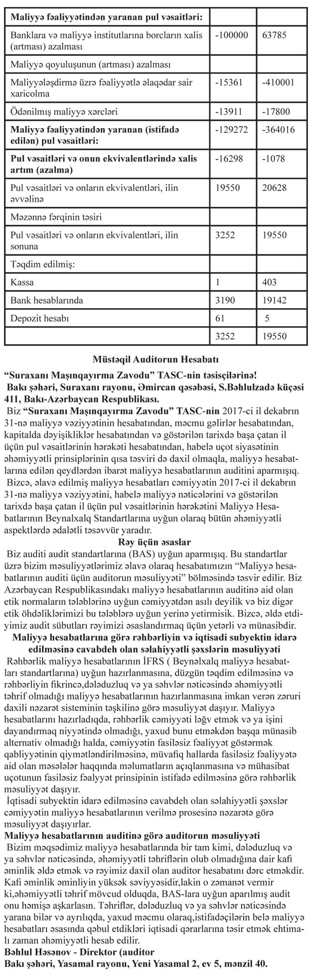 “Suraxanı Maşınqayırma Zavodu” TASC-nin 2017-ci il dekabrın 31-nə maliyyə vəziyyəti haqqında hesabatı, manatla