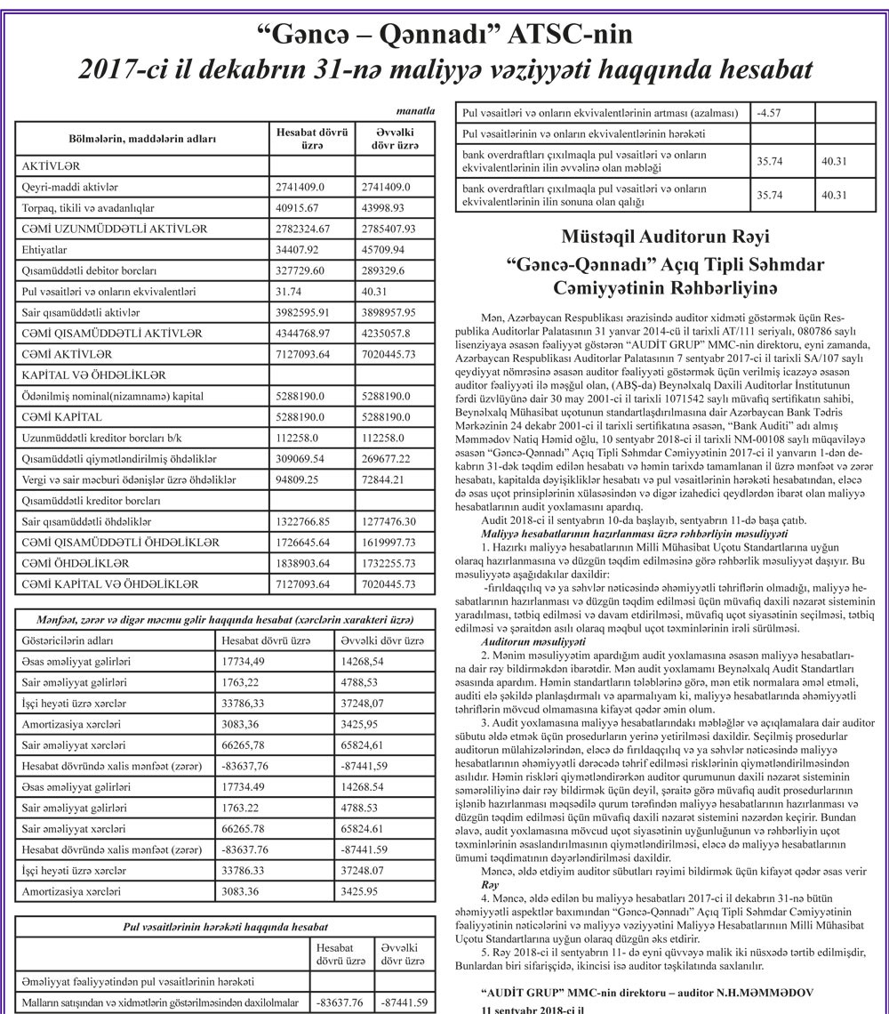 “Gəncə – Qənnadı” ATSC 2017-ci ili 83 min 637 min manat zərər ilə başa vurub. Şirkət 2016-cı ili 87 min 441 manat zərər ilə bağlamışdı.
