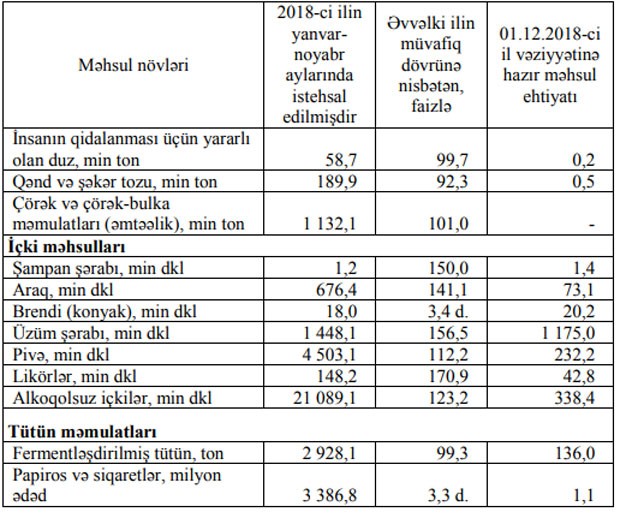 Əvvəlki ilin yanvar-noyabr ayları ilə müqayisədə tütün məmulatlarının istehsalında 2,2 dəfə, içki istehsalında 8,3 faiz, qida məhsullarının istehsalında isə 1,0 faiz artım müşahidə olunmuşdur.
