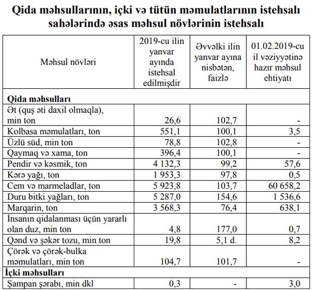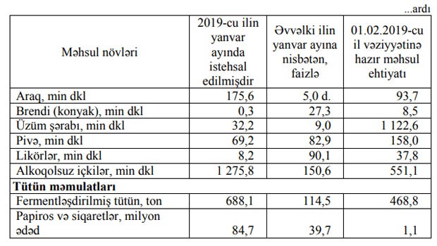 2018-ci ilin yanvar ayı ilə müqayisədə Azərbaycanda içki istehsalında 48,9 faiz, qida məhsullarının istehsalında 14,3 faiz artım, tütün məmulatlarının istehsalında isə 33,5 faiz azalma müşahidə olunmuşdur.