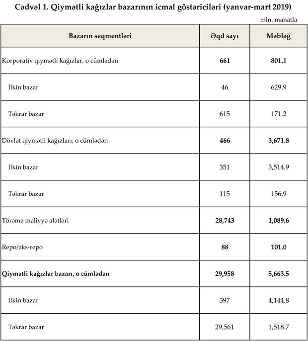 Maliyyə Bazarlarına Nəzarət Palatasının yaydığı məlumata görə, 2019-cu ilin I rübü ərzində qiymətli kağızlar bazarında ümumilikdə 5 milyard 663.5 milyon manat həcmində əməliyyat aparılıb.