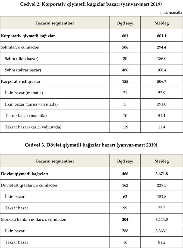 Əməliyyatların 73.2%-i (4 milyard 144.8 milyon manat) ilkin bazarda, 26.8%-i (1 milyard 518.7 milyon manat) isə təkrar bazarda aparılıb. Belə ki, cari ilin yanvar-mart ayları ərzində qiymətli kağızların ilkin bazarı ötən ilin müvafiq dövrü ilə müqayisədə 36% (1 milyard 103.2 milyon manata) artıb.