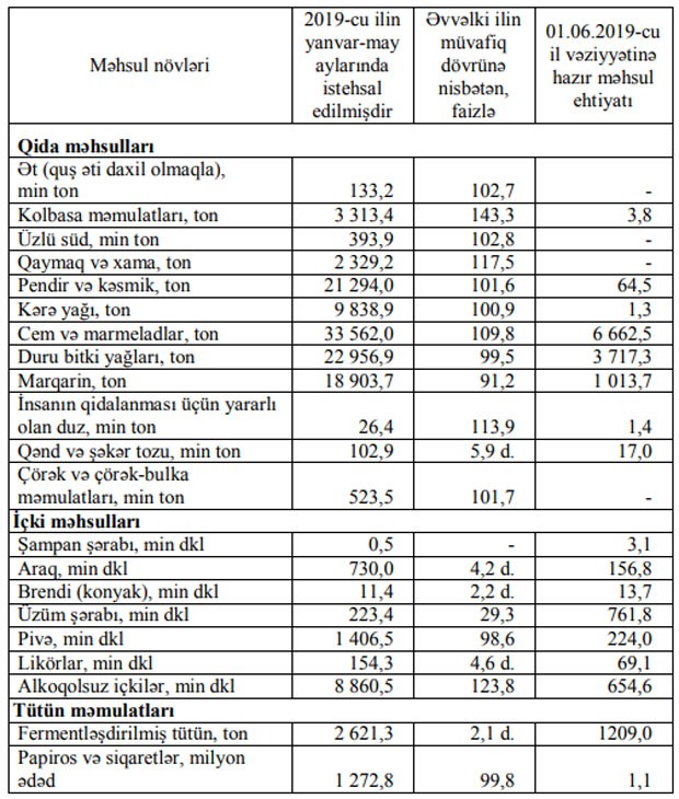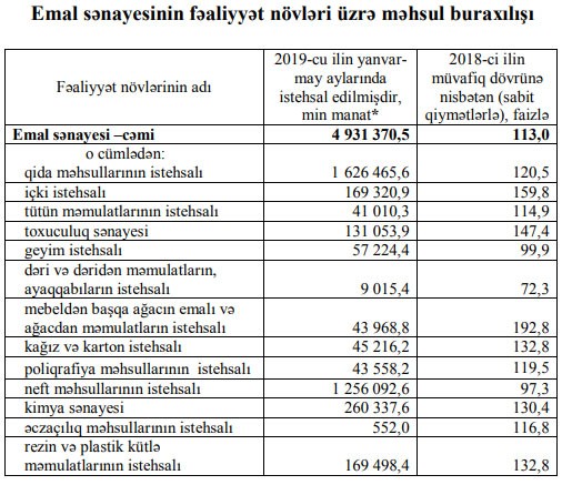 2018-ci lin yanvar-may ayları ilə müqayisədə 2019-cu ilin yanvar-may ayları ərzində qida məhsullarının istehsalı 20,5% artaraq 1 milyard 626 milyon manata çatıb.