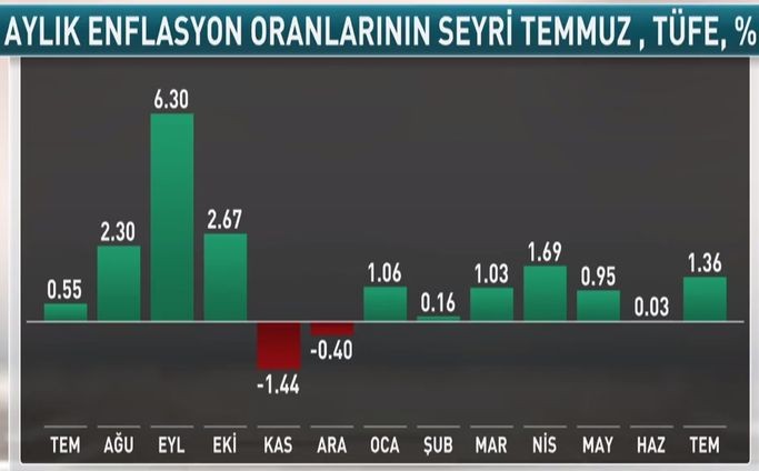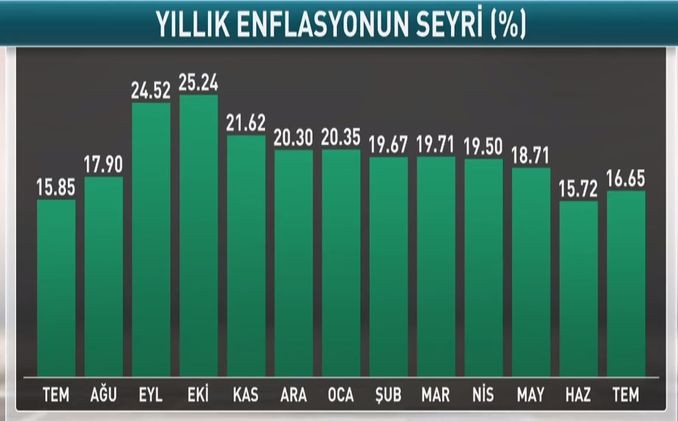 Türkiyədə istehlakçı qiymətləri indeksi (inflyasiya) İyulda aylıq müqayisədə 1.36% artıb, illik müqayisədə isə 15.72%-dən 16.65%-ə yüksəlib.