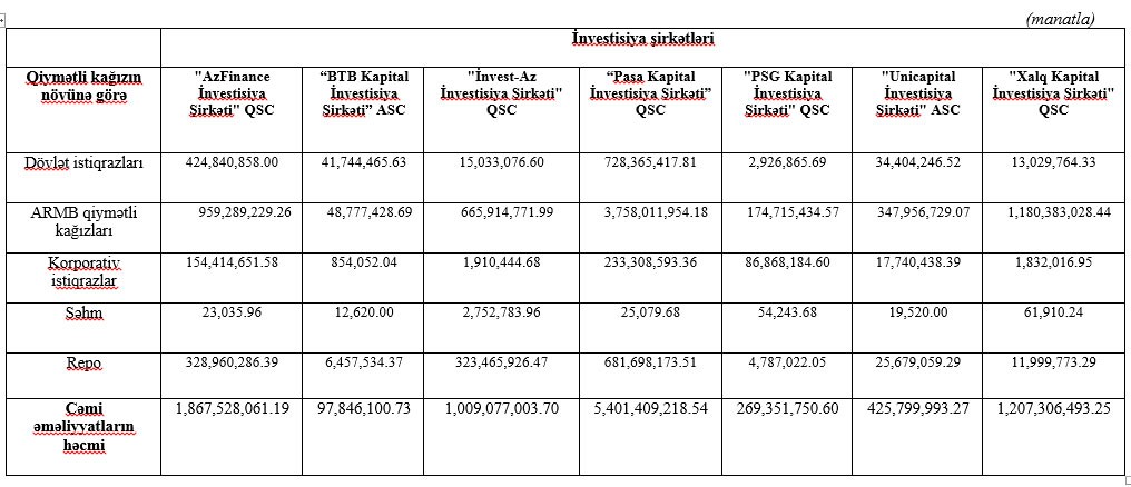 İkinci yerdə 1 milyard 867 milyon manat dövriyyə ilə "AzFinance İnvestisiya Şirkəti" QSC, üçüncü yerdə 1 milyard 2017 milyon manat dövriyyə ilə "Xalq Kapital İnvestisiya Şirkəti" QSC, dördüncü yerdə isə 1 milyard 9 milyon manat dövriyyə ilə "İnvest-Az İnvestisiya Şirkəti" QSC olub.