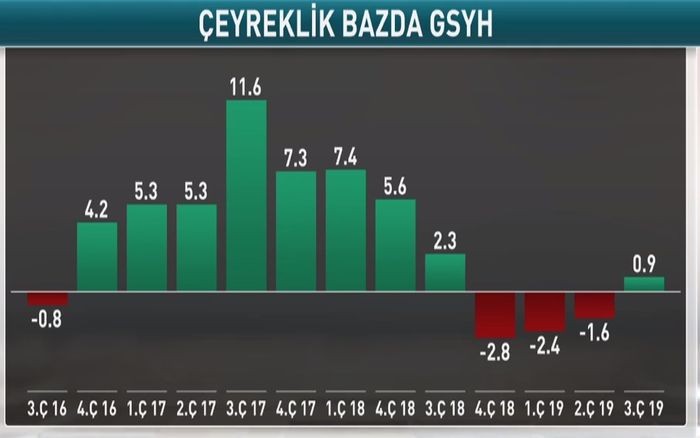 Türkiyə iqtisadiyyatı 2019-cu ilin 2-ci rübündə azalmanın ardından ilin 3-cü rübündə ötən ilin eyni rübü ilə müqayisədə 0.9% artıb.