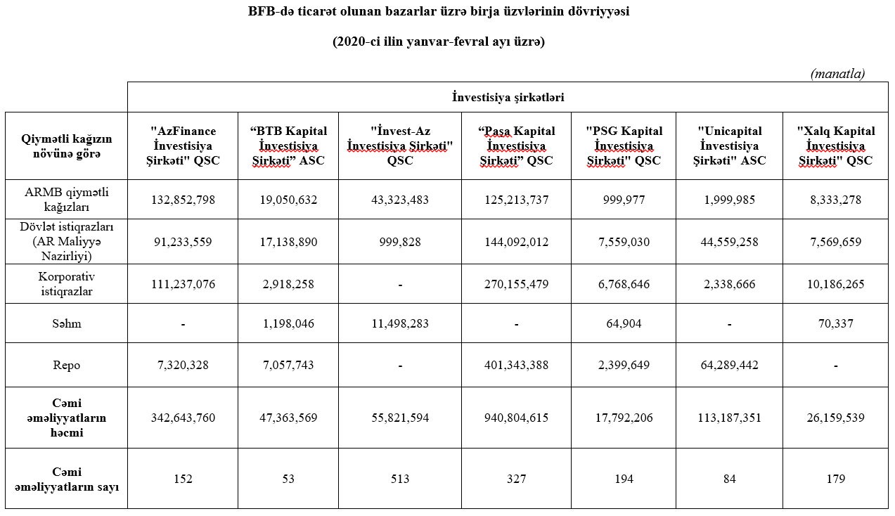 “Marja” Bakı Fond Birjasına istinadən xəbər verir ki, 940 milyon 804 min manat manat dövriyyə ilə “PAŞA Kapital İnvestisiya Şirkəti” 1-ci, 342 milyon 643 min manat dövriyyə ilə "AzFinance İnvestisiya Şirkəti" 2-ci, 113 milyon 187 min manat dövriyyə ilə "Unicapital İnvestisiya Şirkəti" 3-cü, 55 milyon 821 min manat dövriyyə ilə "İnvest-Az İnvestisiya Şirkəti" 4-cü yeri tutub.