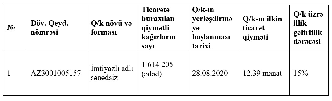 Bir səhmin ilkin ticarət qiyməti 12.39 manatdır. Ticarətə 1 614 205 səhm buraxılacaq. Səhmlər üzrə illik gəlirlilik dərəcəsi 15% təşkil edir.