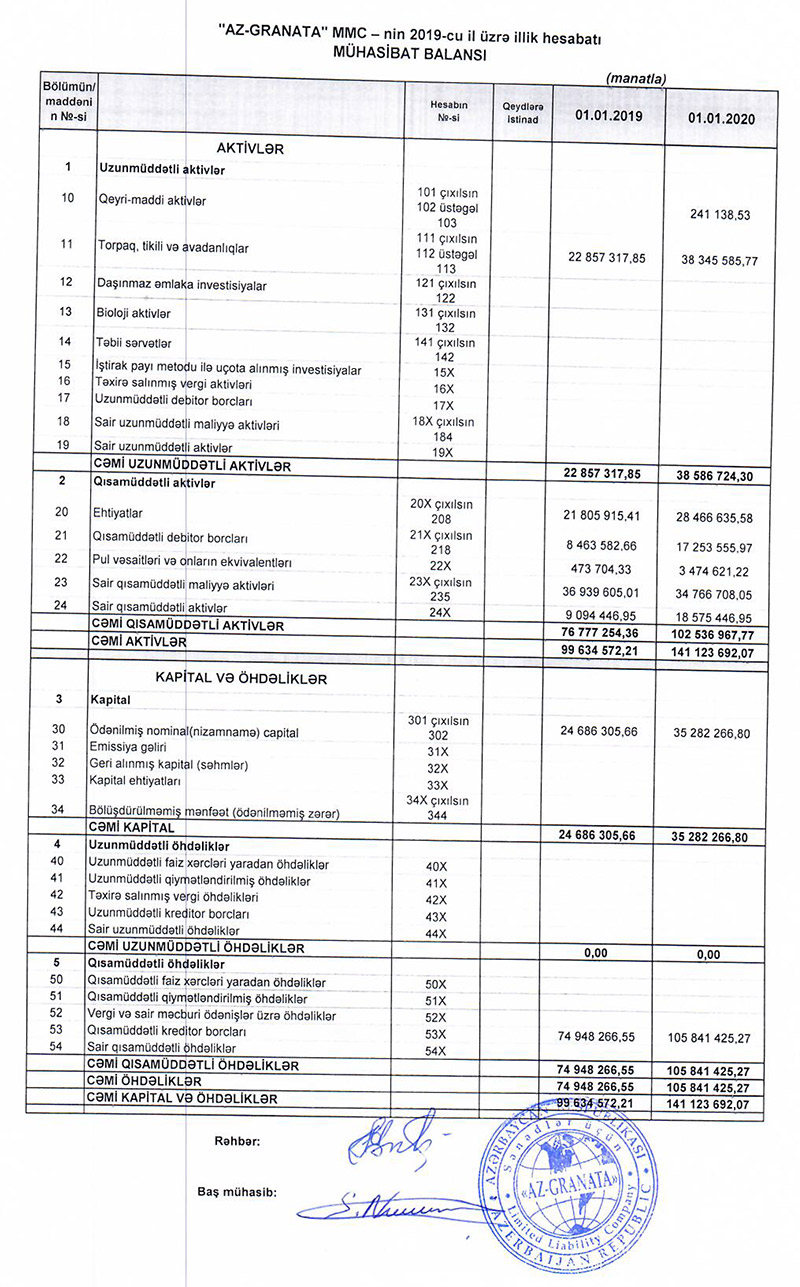 Ötən il "Az-Granata"nın cəmi aktivləri 41 milyon 489 min manat artaraq 01 Yanvar 2020-ci il tarixində 141 milyon 124 min manat təşkil edib.