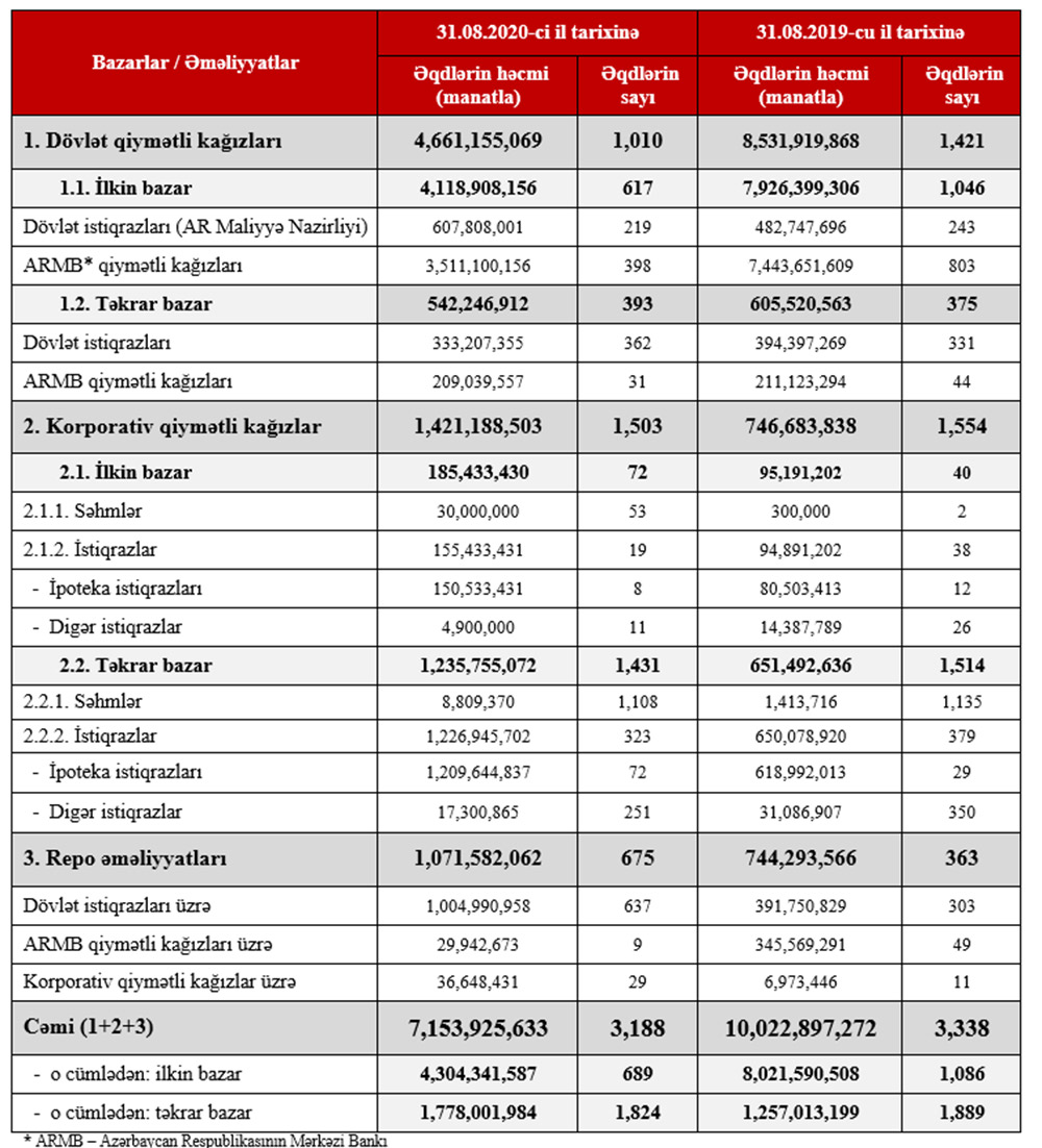 “Nəticə olaraq, 2020-ci ilin yanvar-avqust ayları üzrə Mərkəzi bank qiymətli kağızları üzrə yerləşdirmələrin həcmində ötən ilə nəzərən azalma müşahidə olumasına baxmayaraq, ümumi təkrar bazar üzrə ticarət həcmində 41%, korporativ qiymətli kağızlar bazarı üzrə 90%, repo əməliyyatları üzrə 44%, səhmlər üzrə ilkin bazarda isə 100 misli böyümə qeydə alınmışdır”,- Birjanın məlumatında deyilir.