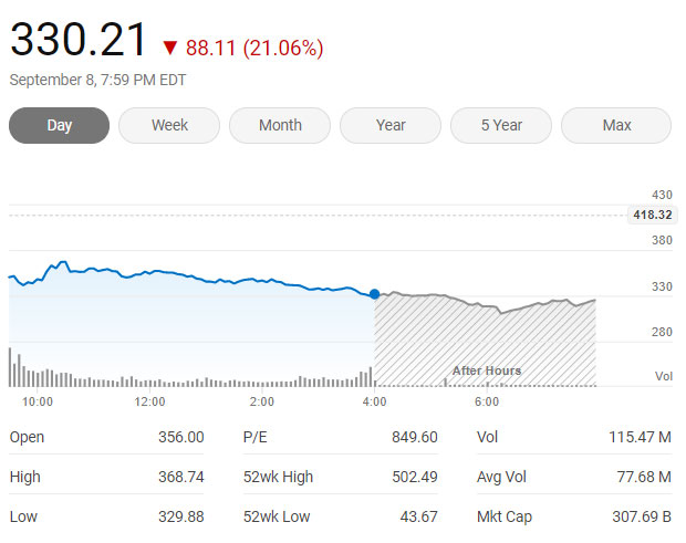 Elon Musk-ın şirkəti Tesla-nın səhmləri Çərşənbə axşamı günü 21% dəyərdən düşərək 330.21 dollara enib və bu ucuzlaşma şirkətin bazar dəyərinin 82 milyard dollar "əriməsinə" səbəb olub.