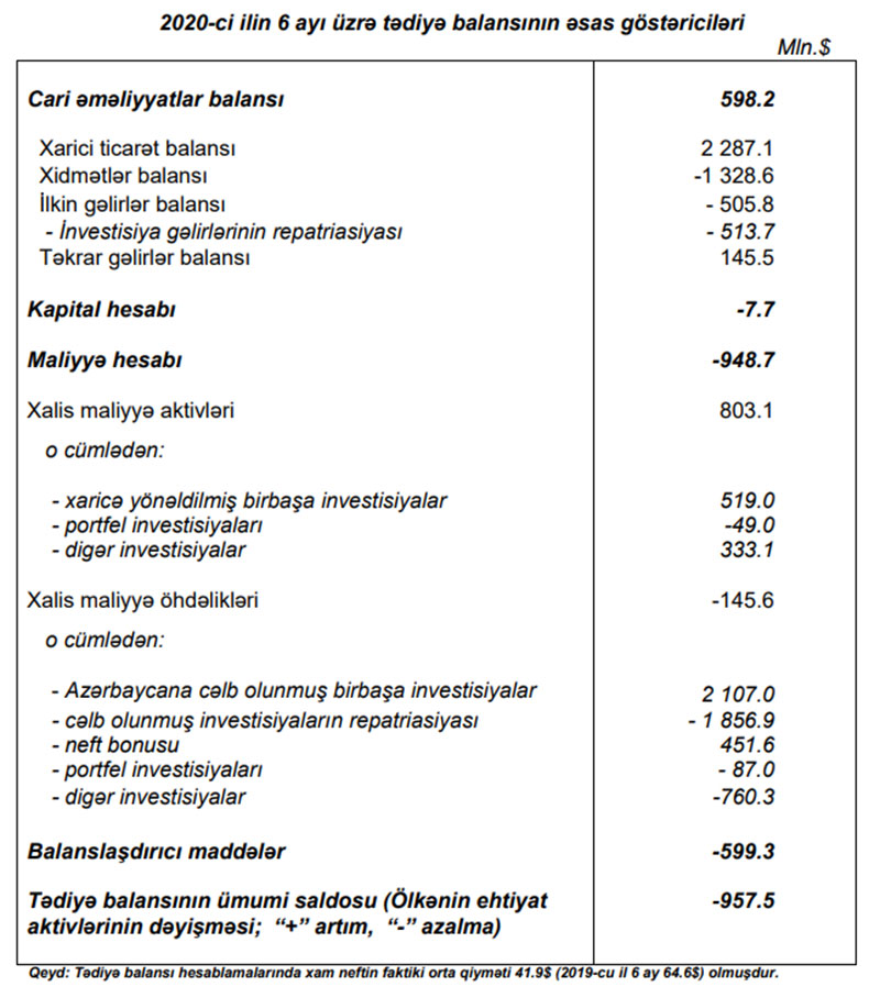 "Xarici mühitin əlverişsiz olduğu bir şəraitdə 2020-ci ilin 6 ayı üzrə tədiyə balansının1 əsas maddələri olan cari əməliyyatlar balansında (CƏB) 598.2 milyon dollar profisit, kapital və maliyyənin hərəkəti hesabında isə 956.4 milyon dollar kəsir yaranmış, ehtiyat aktivləri 957.5 milyon dollar azalmışdır. Bu dövrdə orta neft qiyməti 41.9 dollar/barel olmuş, qeyri-neft ixracı isə 6.1% azalmışdır“, - Mərkəzi Bankın məlumatında bildirilir.