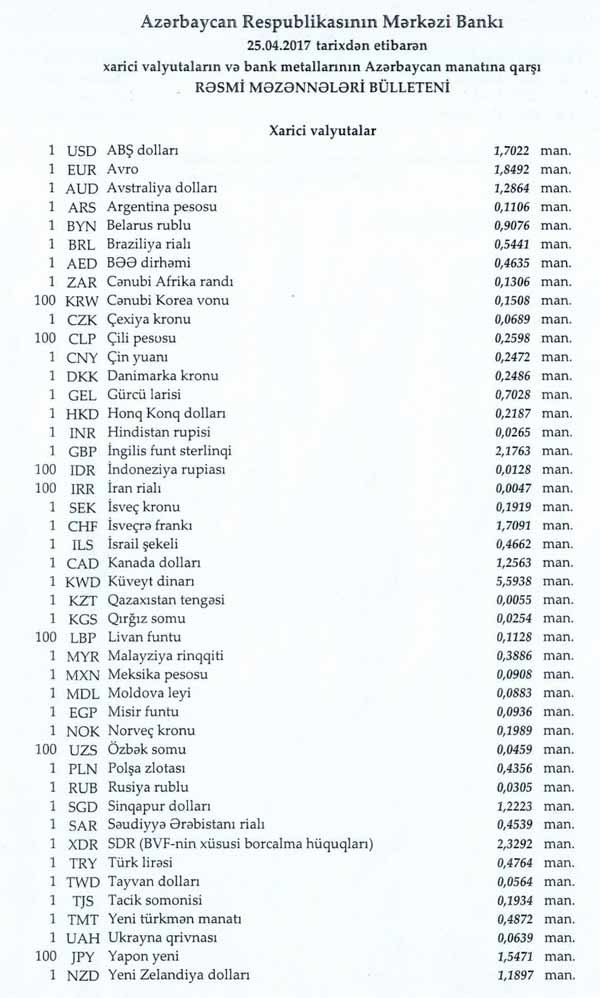 Aprelin 25-nə Mərkəzi Bankın açıqladığı rəsmi Dollar/manat məzənnəsi Aprelin 24-ü ilə müqayisədə dəyişməyərək 1,7022 manat olub, Avro/manat məzənnəsi isə 1.8492 manata qalxıb.