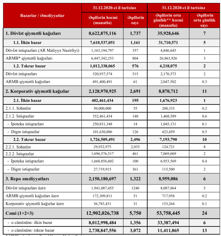 Bakı Fond Birjasında 2020-ci ilin yanvar-dekabr ayları ərzində qiymətli kağızlar üzrə keçirilən əməliyyatların ümumi həcmi 12 milyard 902 milyon 26 min 738 manat təşkil etmişdir.