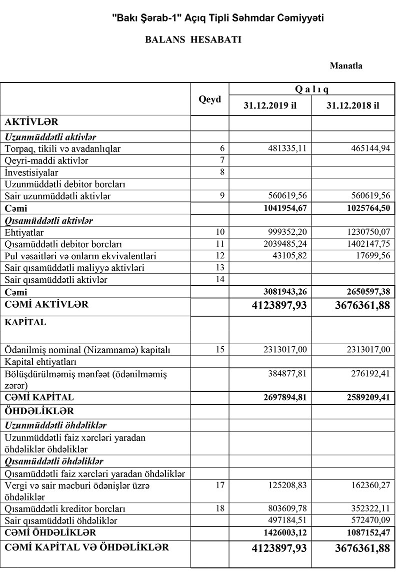 31 Dekabr 2019-cu ildə “Bakı Şərab-1” 4 milyon 123 min 897 manat cəmi aktivlərə malik olub. 2018-ci ilin sonunda ATSC 3 milyon 676 min 361 manat cəmi aktivlərə malik idi. Ötən il “Bakı Şərab-1”də qısamüddətli debitor borclar 637 min manat artaraq 2 milyon 39 min manata çatıb. Şərəb istehsalçısının qısamüddətli kreditor borcları isə 2.3 dəfə artaraq 804 min manata yüksəlib.