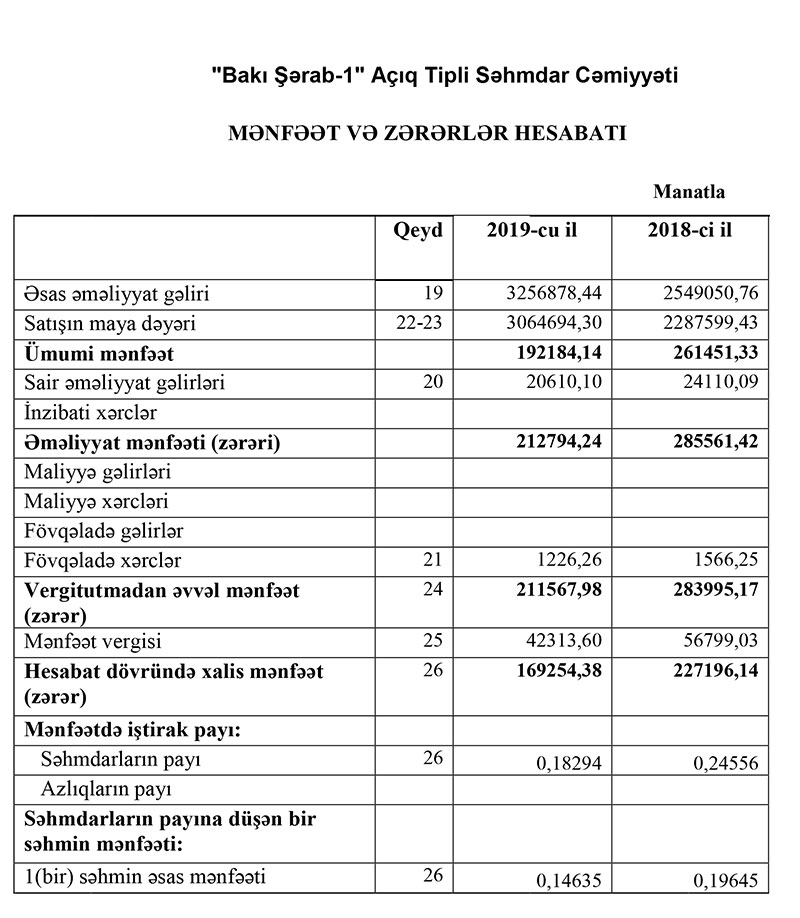 “Bakı Şərab-1” ATSC 2019-ci ili 169 min manat xalis mənfəət ilə başa vurub. Bu, 2018-ci illə müqayisədə 25,6% azdır. “Bakı Şərab-1” 2018-ci ili 227 min manat, 2017-ci ili 64 min manat xalis mənfəətlə bağlamışdı. 2018-c ildə “Bakı Şərab-1”in xalis mənfəətinin artması xərclərin azalması ilə bağlı idi.