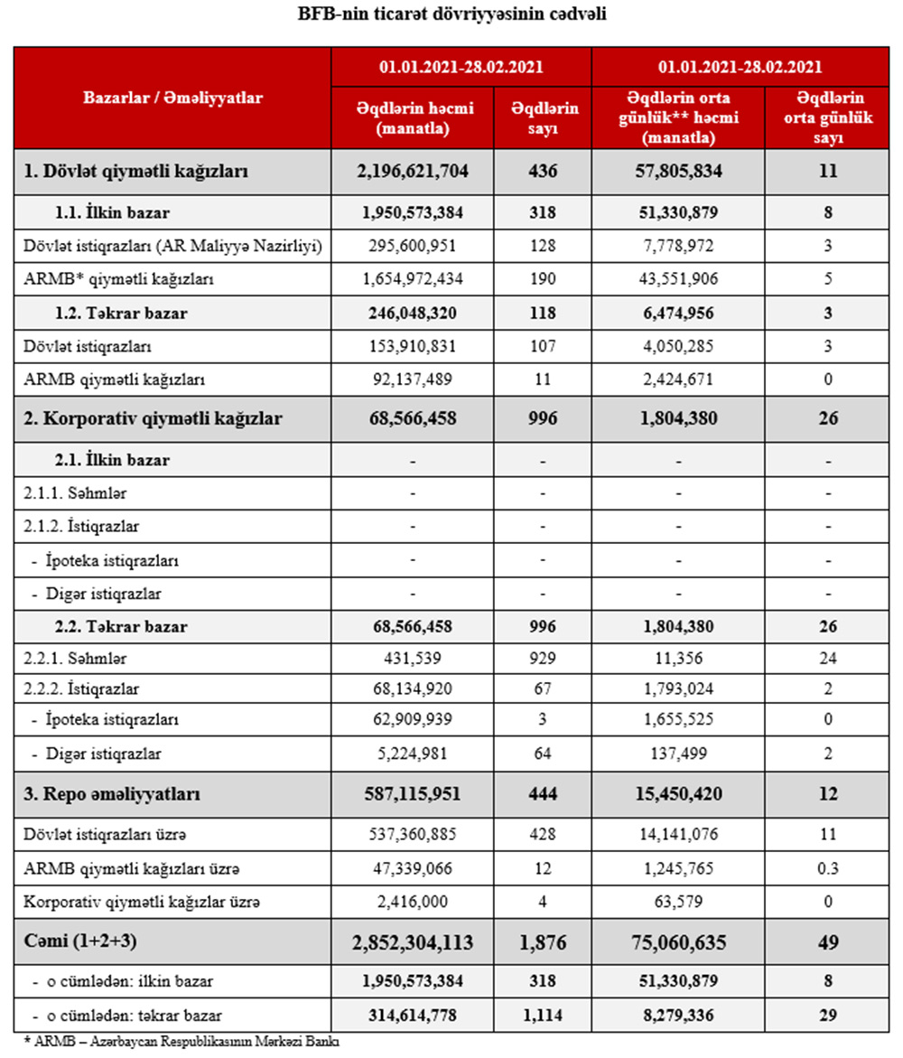 Bakı Fond Birjasında 2021-ci ilin yanvar-fevral ayları ərzində qiymətli kağızlar üzrə keçirilən əməliyyatların ümumi həcmi 2 milyard 852 milyon 304 min manat təşkil edib. Bu, ötən ilin eyni dövrü ilə müqayisədə 2,6 dəfə çoxdur.