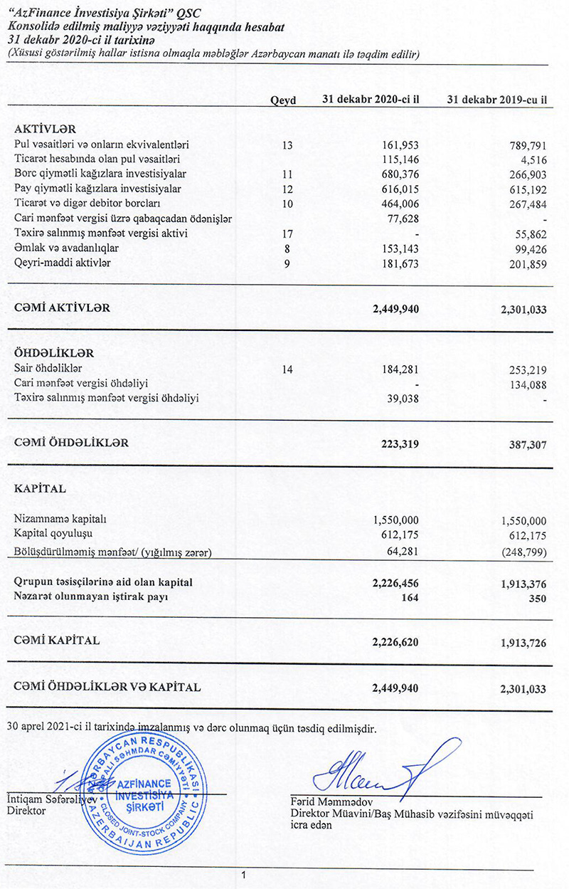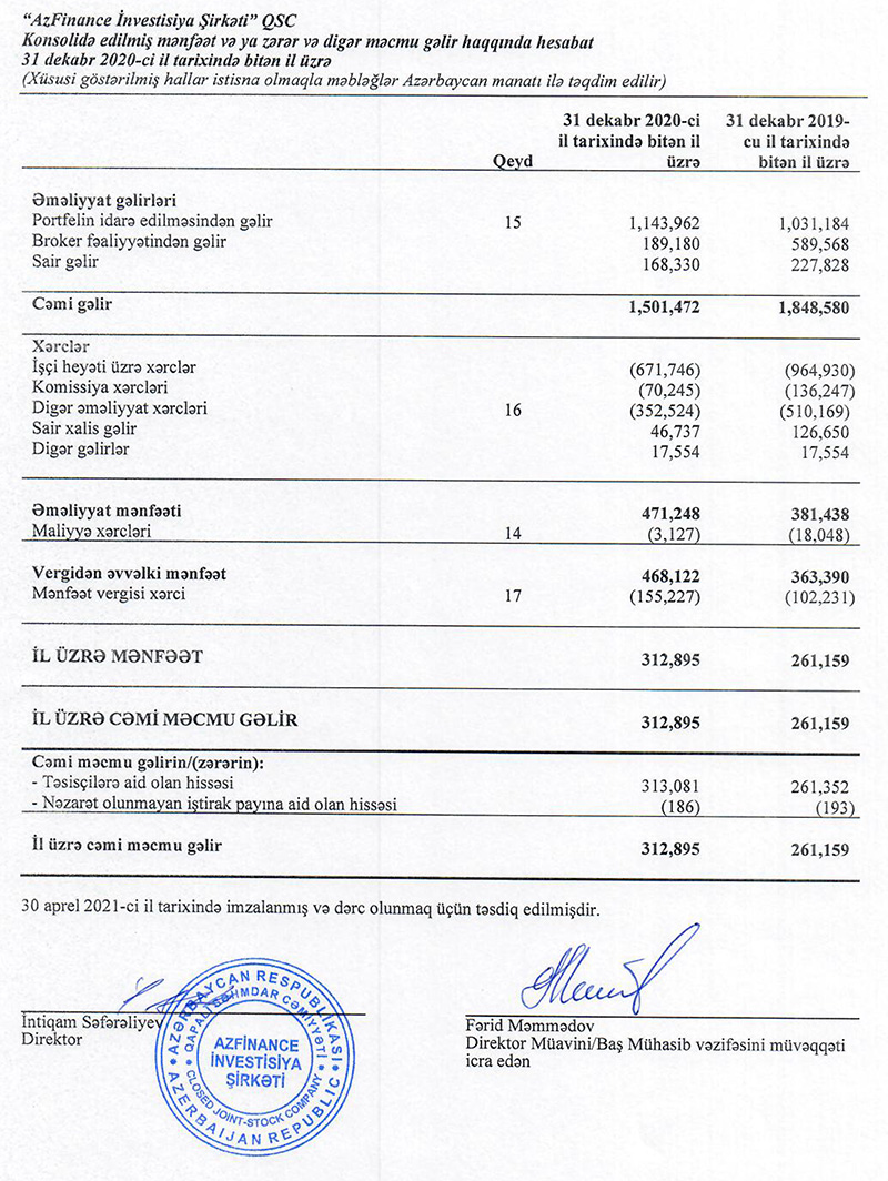 Marja şirkətin illik hesabatına istinadən xəbər verir ki, 2019-cu ildə 1 milyon 849 min manat təşkil etmiş cəmi gəlirlər 2020-ci ildə 1 milyon 501 min manata geriləyib (347 min manat və ya 19% azalıb). O cümlədən, "AzFinance"ın portfelin idarə edilməsindən gəliri 1 milyon 31 min manatdan 1 milyon 144 min manata yüksəlib, broker fəaliyyətindən gəlir 3 dəfədən çox azalaraq 590 min manatdan 189 min manata, sair gəlirlər isə 228 min manatdan 168 min manata geriləyib.
