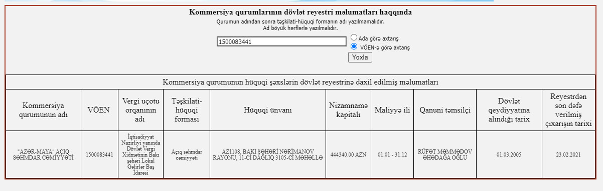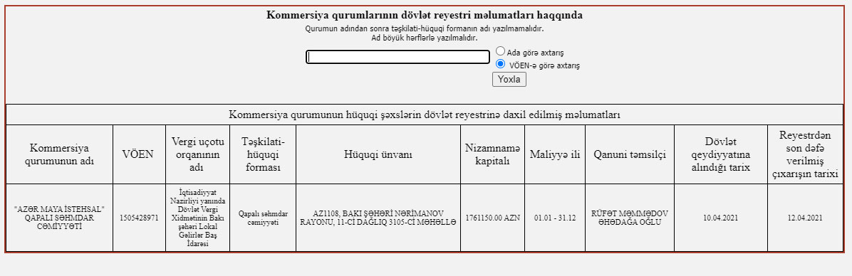 İqtisadiyyat Nazirliyi yanında Dövlət Vergi Xidməti "Azər-Maya İstehsal" QSC-ni dövlət qeydiyyatına alıb.
