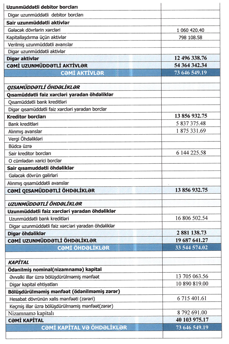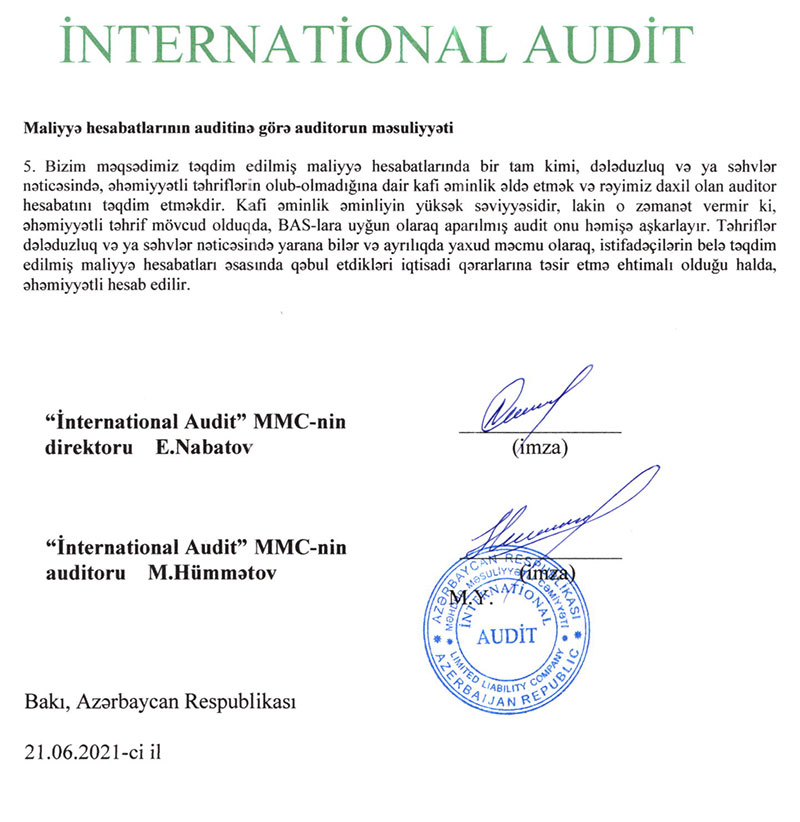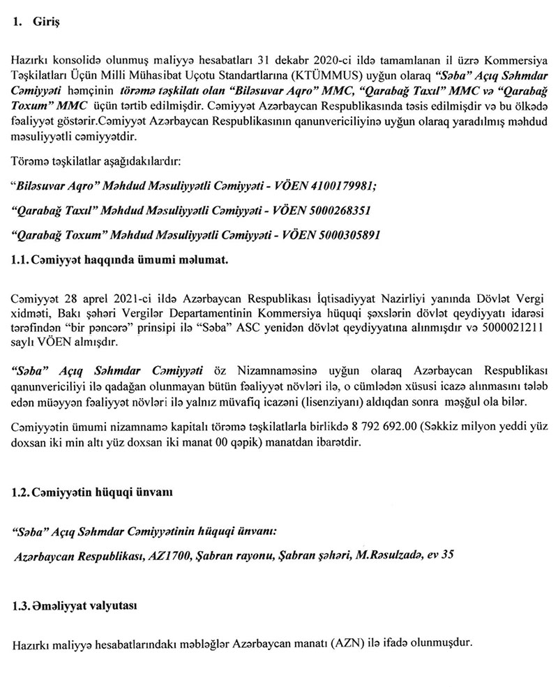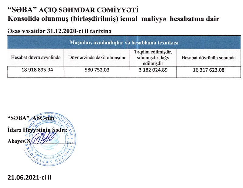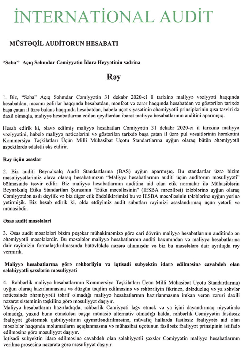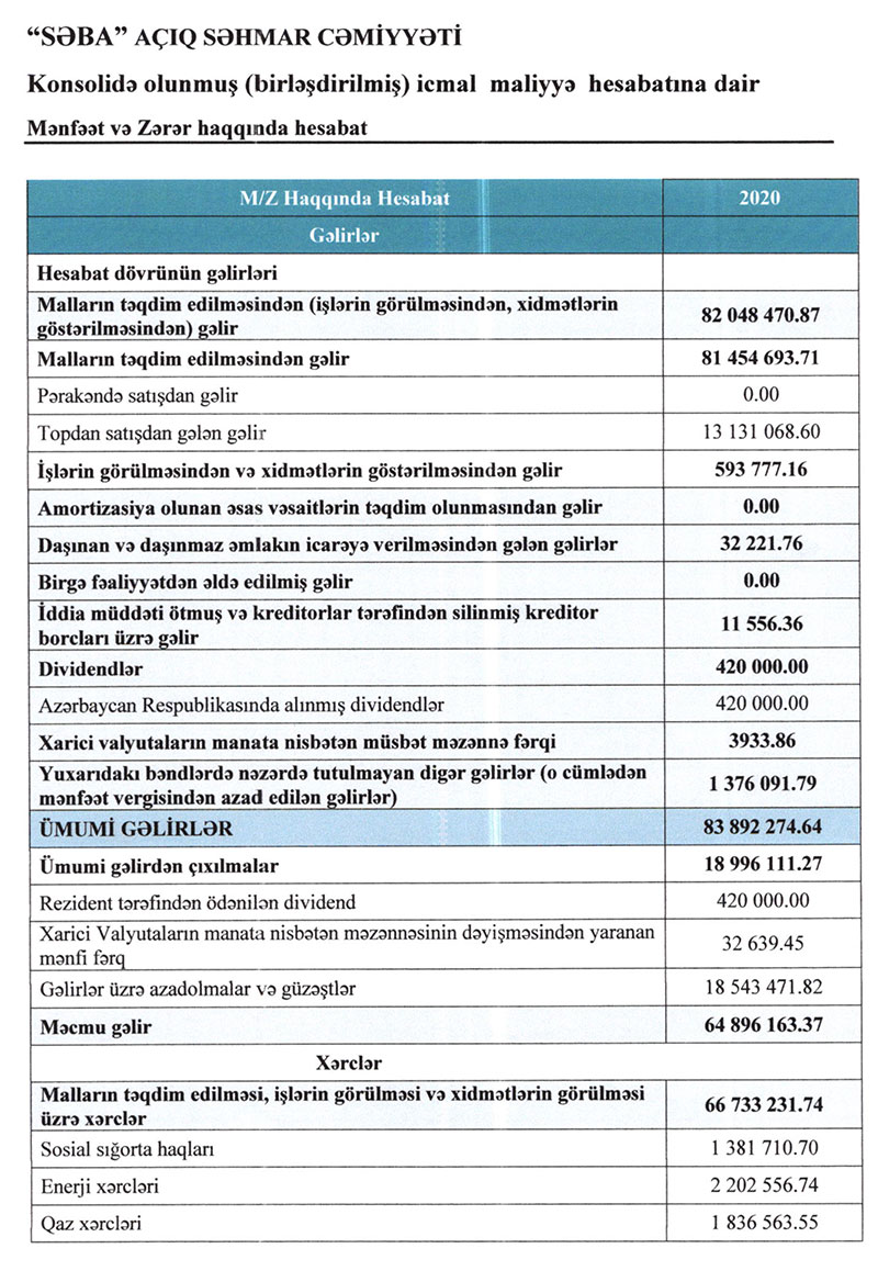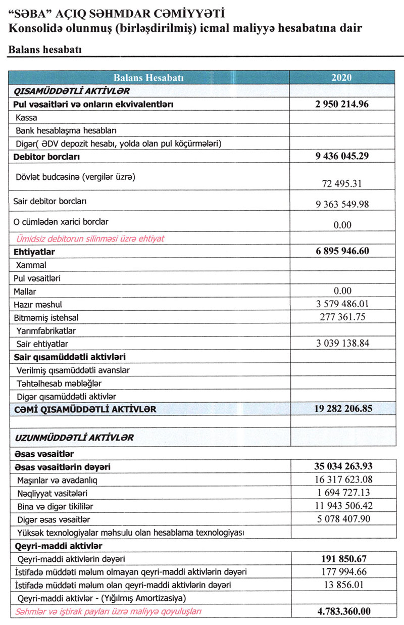 "SƏBA" ASC-nin 01.01.2020-31.12.2020-ci il tarixi üzrə konsolidə edilmiş maliyyə hesabatları