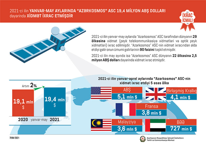 İcmalda qeyd edilib ki, 2021-ci ilin yanvar-may aylarında “Azərkosmos” ASC tərəfindən dünyanın 29 ölkəsinə 19,4 milyon ABŞ dolları dəyərində xidmət (peyk telekommunikasiya xidmətləri və optik peyk xidmətləri) ixrac edilib.
