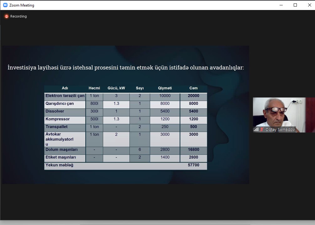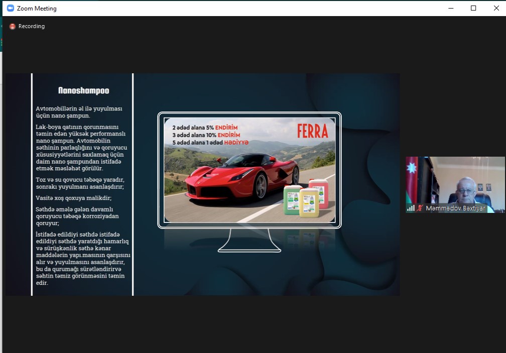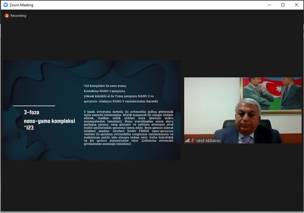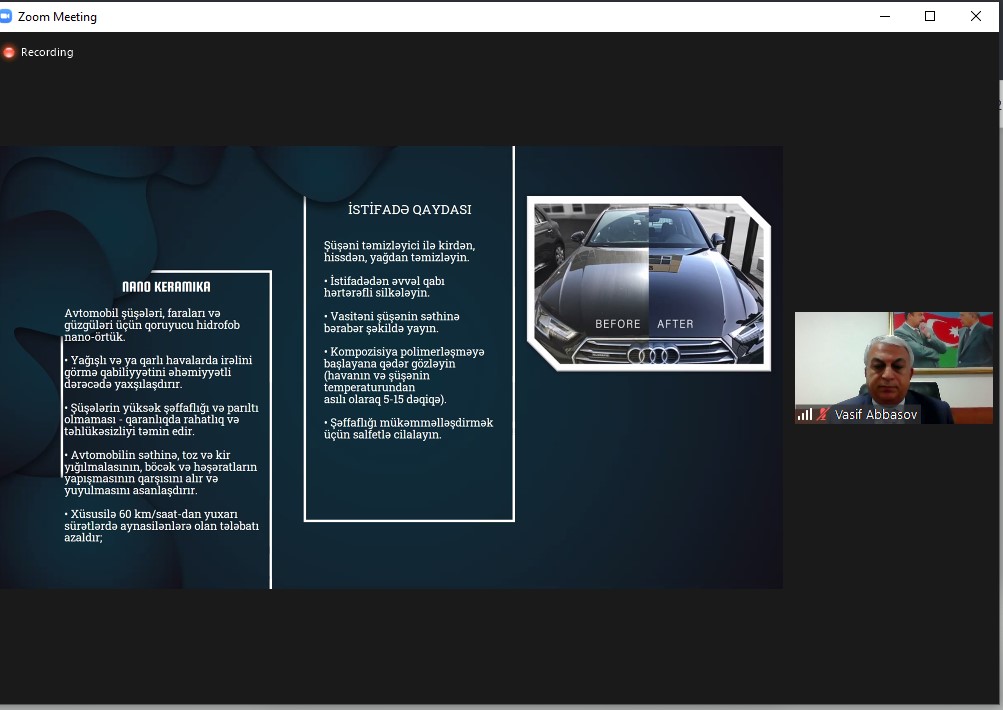 Daha sonra “PROLİNE CHEMİCALS” MMC-nin təsisçisi və rəhbəri Vüqar Həsənov mikro və makro silikon emulsiyalarından istifadə olunmaqla müxtəlif bərk səthlər üzərində nanohissəciklərdən ibarət hidrofob və antistatik qoruyucu təbəqə yaradan vasitələrin istehsalı ilə bağlı investiya layihəsi haqqında məlumat verib.