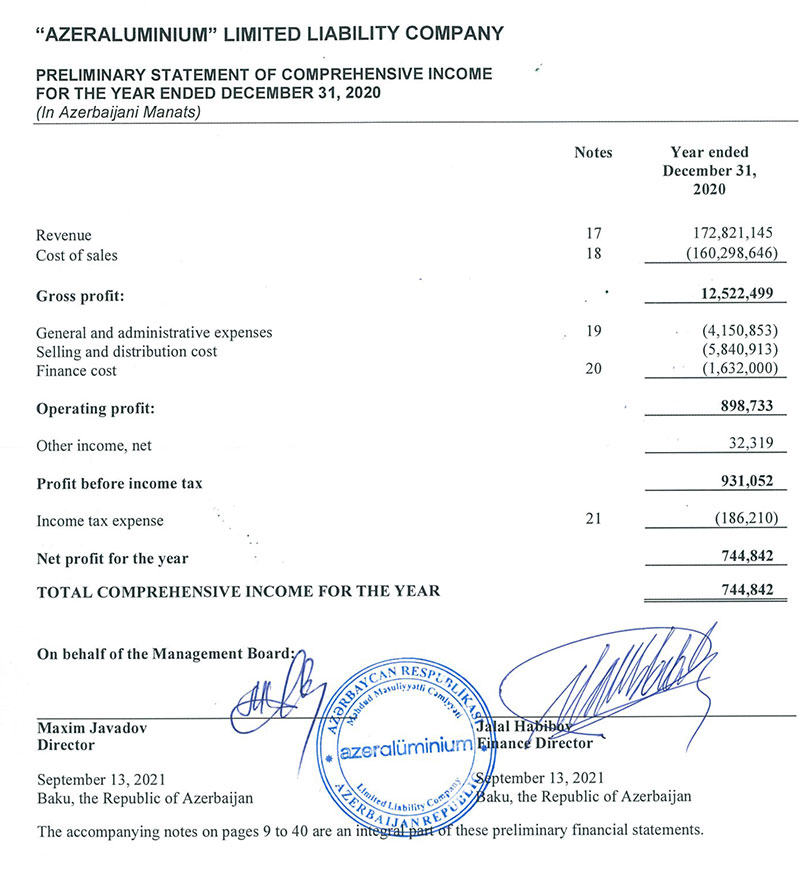 Ötən il Şirkətin satışdan gəlirləri 172 milyon 821 min 145 manat, satışın maya dəyəri isə 160 milyon 298 min 646 manat olub. Müqayisə üçün qeyd edək ki, 2019-cu ildə “Azəralüminium”un əsas əməliyyat gəlirləri 203 milyon 197 min manat (2018-ci illə müqayisədə 10,7 dəfə çox), satışının maya dəyəri 179 milyon 812 min manat (11 dəfə çox) təşkil etmişdi.