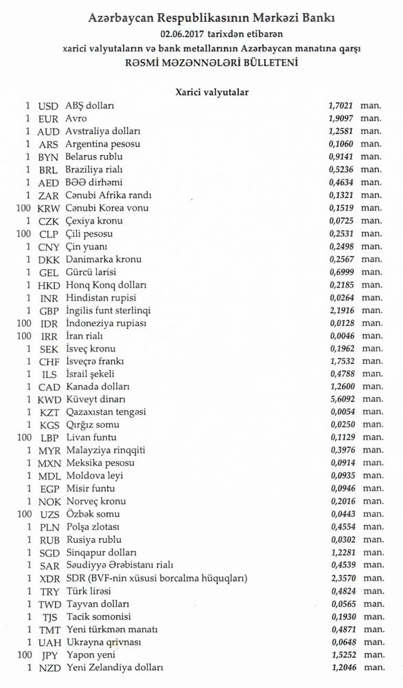 İyunun 1-də rəsmi olaraq 1 dollar 1,7020 manata, 1 avro isə 1.9141 manata bərabər idi.