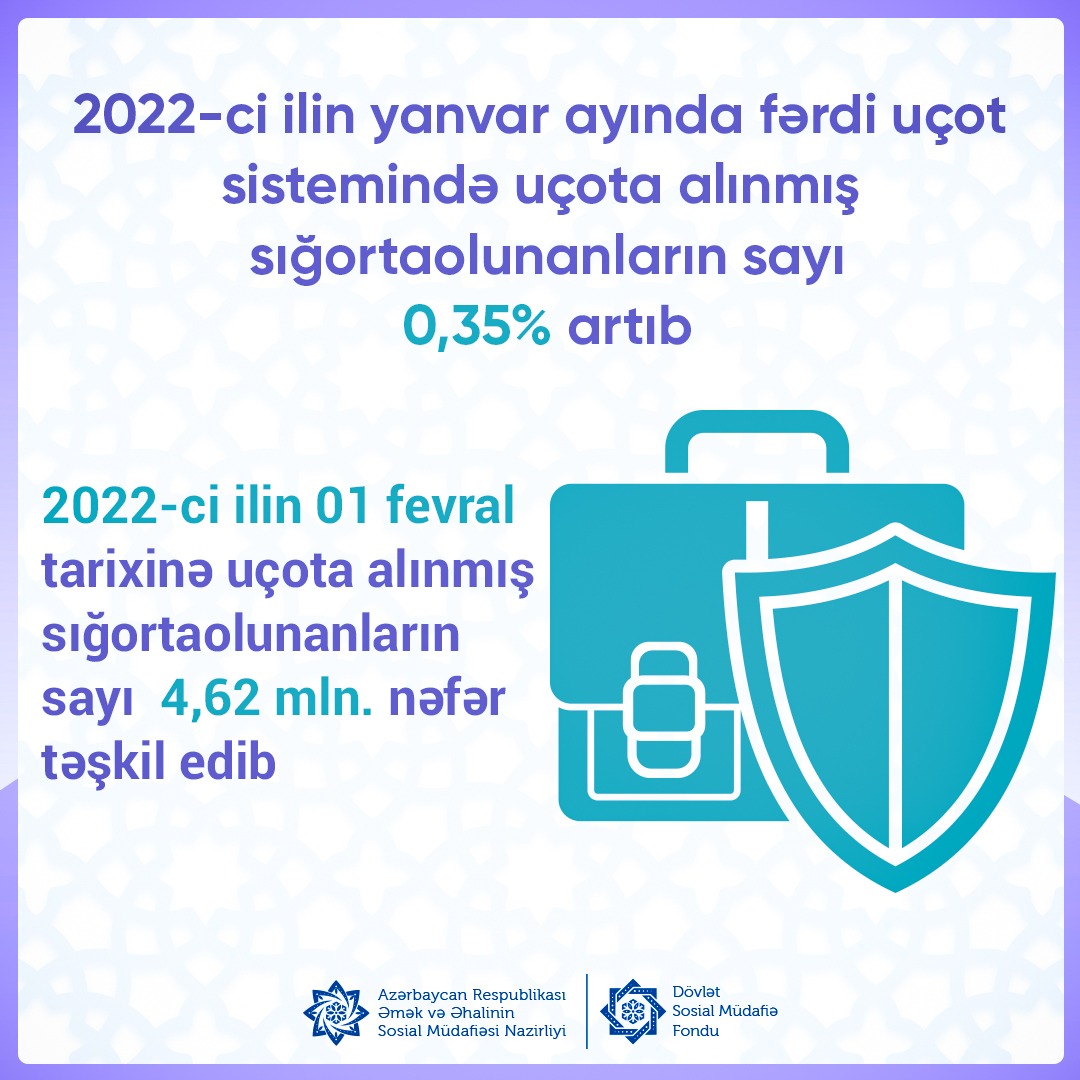 Dövlət Sosial Müdafiə Fondunun yaydığı məlumata görə, 2022-ci ilin 01 fevral tarixinə uçota alınmış sığortaolunanların sayı 4,62 milyon nəfər təşkil edib.