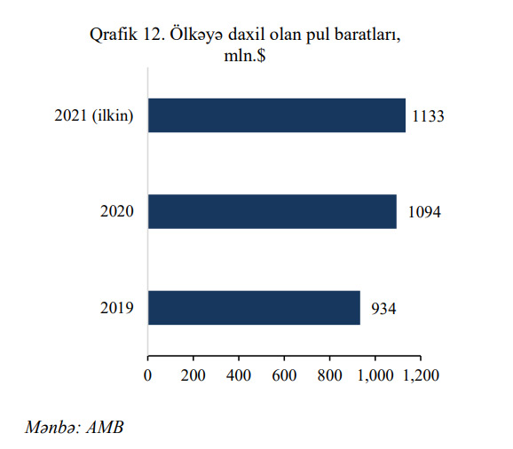 Ölkəmizə daxil olan pul baratları 2019-cu ildə 934 milyon dollar, 2020-ci ildə 1 milyard 94 milyon dollar təşkil etmişdi.