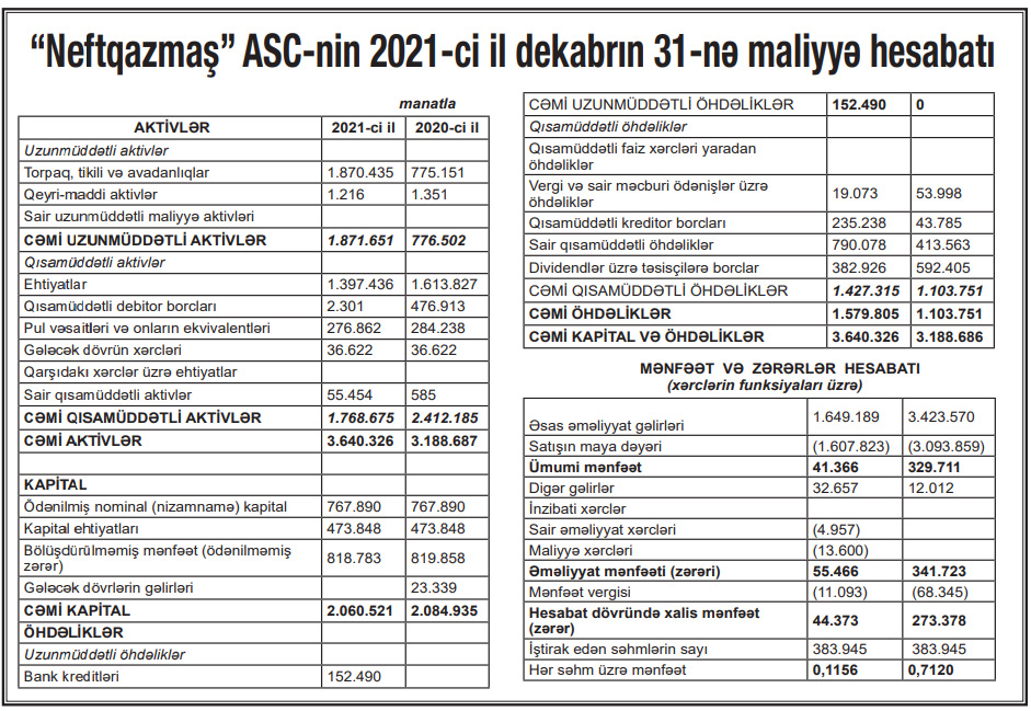 31 Mart 2021-ci il tarixində “Neftqazmaş” ASC-nin cəmi aktivləri 3 milyon 640 min 326 manat təşkil edib. Şirkət 2020-ci ilin sonunda 3 milyon 188 min 687 manat cəmi aktivlərə malik idi.