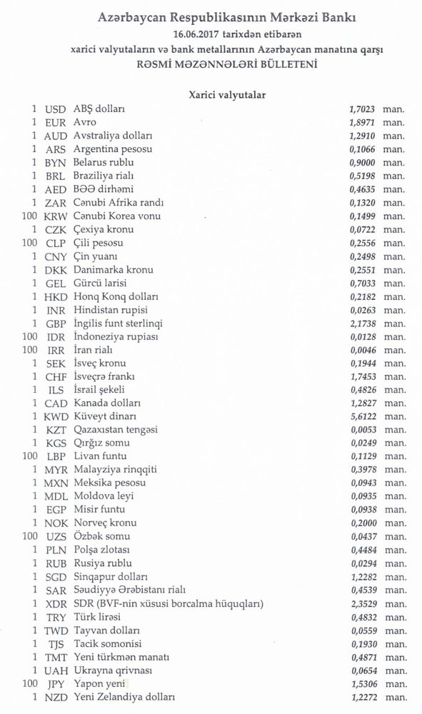 İyunun 16-na Mərkəzi Bankın açıqladığı rəsmi Dollar/manat məzənnəsi İyunun 14-ü ilə müqayisədə dəyişməyərək 1,7023 manat olub, Avro/manat məzənnəsi 1.8971 manata dw.wb.