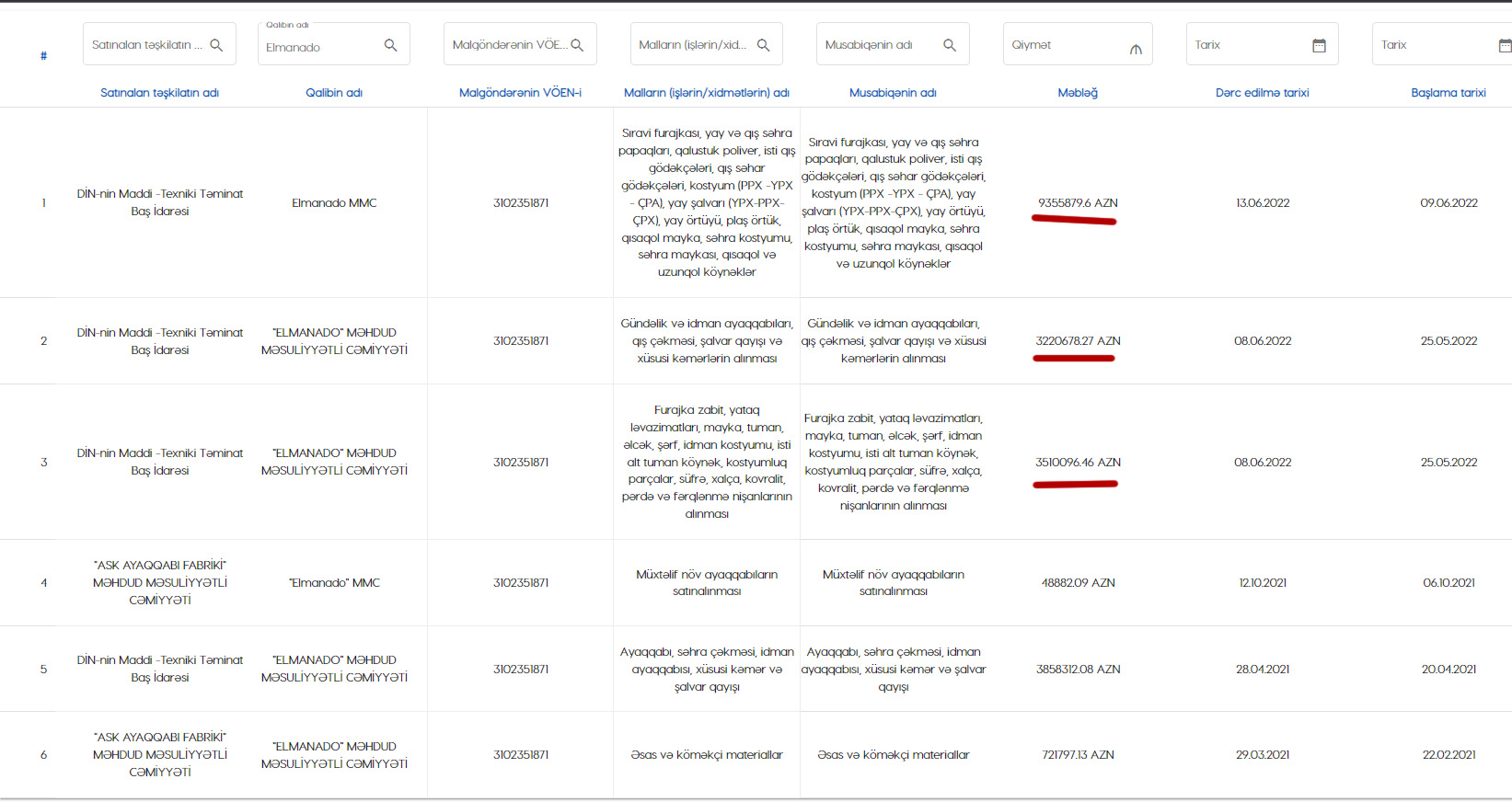 2021-ci ilin Aprel ayınnda da "Elmanado" MMC Daxili İşlər Nazirliyinin Maddi -Texniki Təminat Baş İdarəsinin "Ayaqqabı, səhra çəkməsi, idman ayaqqabısı, xüsusi kəmər və şalvar qayışı" alınması ilə bağlı keçirdiyi tenderin qalibi olmuşdu. Həmin tender üzrə 3 milyon 858 min manatlıq müqavilə imzalanmışdı.