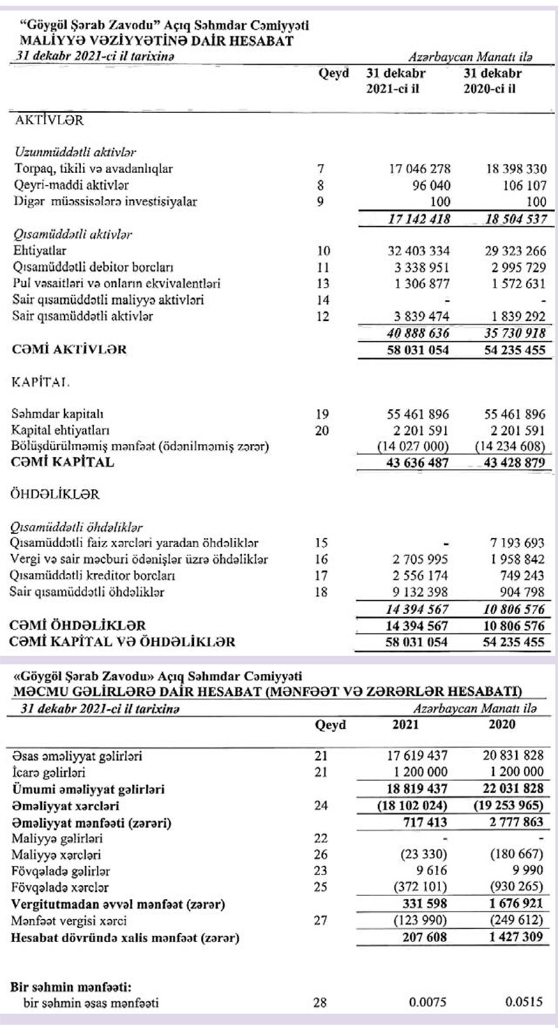 “Göygöl Şərab Zavodu” ASC 2021-ci ili 207 min 608 manat xalis mənfəət ilə başa vurub. Halbuki, ASC 2020-ci ili 1 milyon 427 min 309 manat xalis mənfəət ilə bağlamışdı. Beləliklə, 2020-ci illə müqayisədə 2020-ci ildə “Göygöl Şərab Zavodu”nun xalis mənfəəti 7 dəfəyə yaxın azalıb.