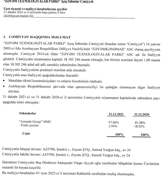 "Azmade Group" şirkətinə daxil olan, metaldan tikinti konstruksiyalarının istehsalı ilə məşğul olan "Zəyəm Texnologiyalar Parkı" ASC 2021-ci il üzrə maliyyə göstəricilərini açıqlayıb.