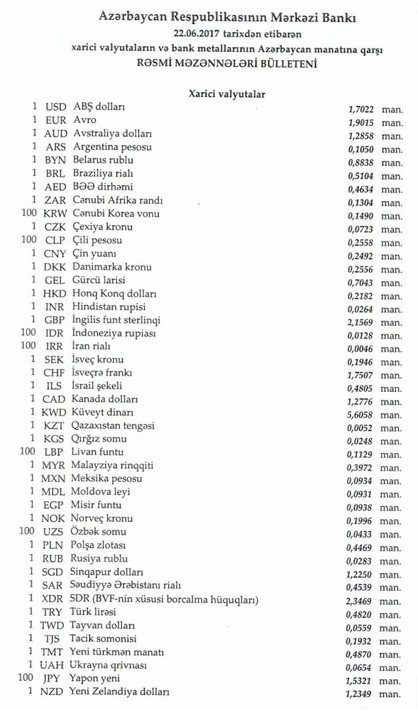 İyunun 21-də rəsmi olaraq 1 dollar 1,7022 manata, 1 avro isə 1.8952 manata bərabər idi.
