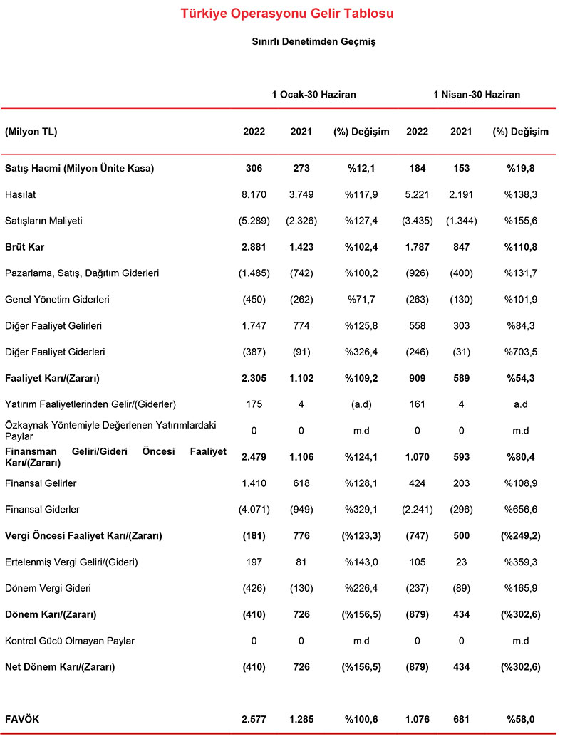 Şirkətin Türkiyədəki əməliyyatlarından ikinci rübdə əldə etdiyi gəlir 138% artaraq 5,2 milyard TL təşkil edib. Beynəlxalq əməliyyatlardan gəlir isə 162,1 faiz artıb.