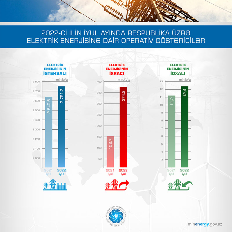 İyul ayında elektrik enerjisinin idxalı 12,4 mln. kVt·st olmaqla 2021-ci ilin müvafiq dövrü ilə müqayisədə 1,2 mln. kVt·st, ixrac isə 374,2 mln. kVt·st olmaqla ötən ilin müvafiq dövrünə nisbətən 221,5 mln. kVt·st artıb.