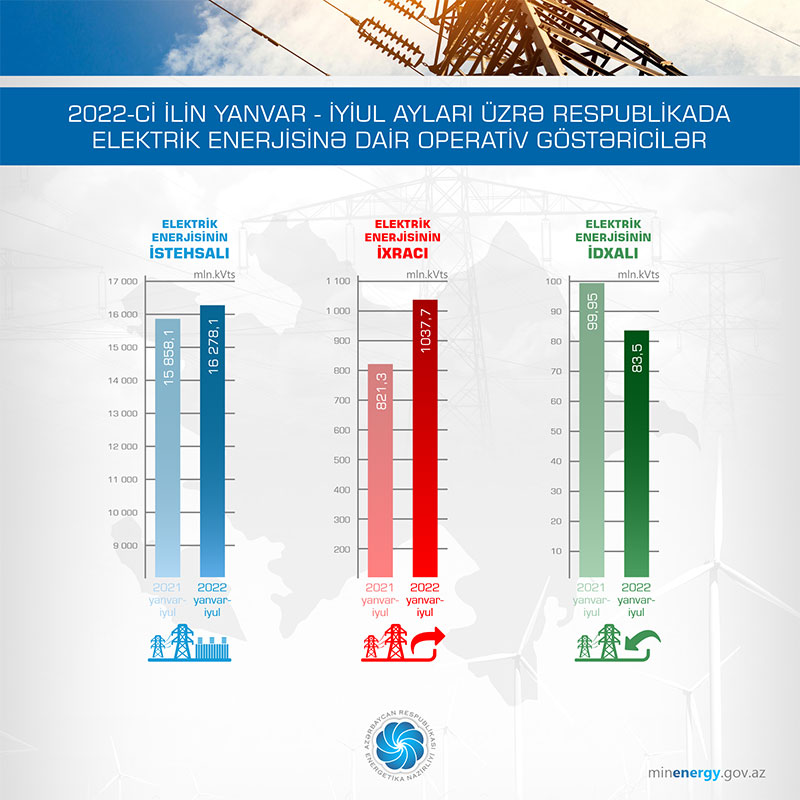 2022-ci ilin yanvar-iyul ayları üzrə elektrik enerjisinin ixracı 1037,7 mln. kVt·st, idxalı isə 83,5 mln. kVt·st olub.