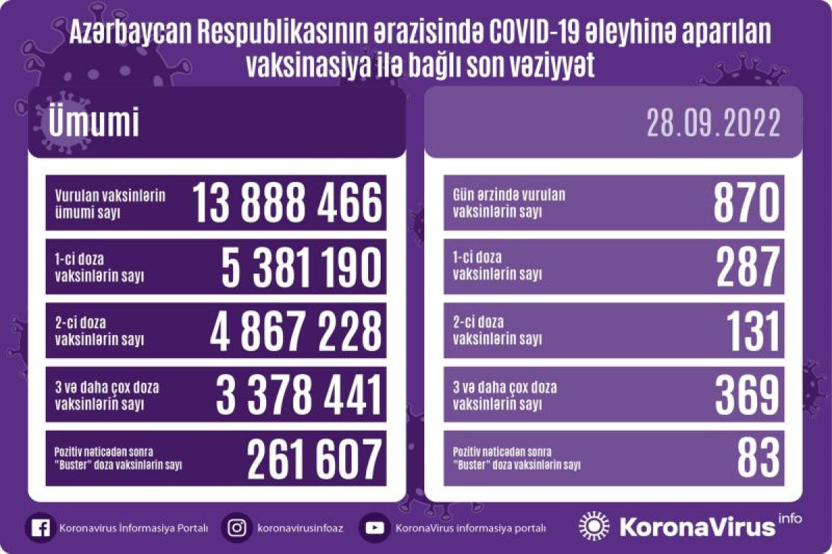 Azərbaycanda son sutkada koronavirus (COVID-19) əleyhinə 870 vaksin vurulub. Bir gündə birinci mərhələ üzrə vaksinasiya olunanların sayı 287, ikinci mərhələ üzrə vaksinasiya olunanların sayı 131, üç və daha çox doza üzrə vaksinasiya olunanların sayı 369, pozitiv nəticədən sonra buster doza üzrə vaksinasiya olunanların sayı 83 nəfərdir.